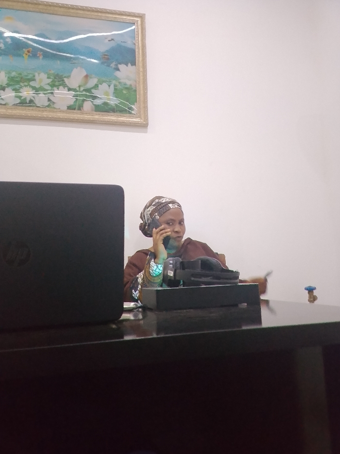 A woman wearing a headscarf is seated at a dark desk with a laptop on the left. She is on the phone, and an object, possibly a VR headset, sits on the desk. The room is sparsely decorated, with a framed picture of a landscape with flowers hanging on the white wall behind her. There is a small blue tap handle visible on the desk's right edge.