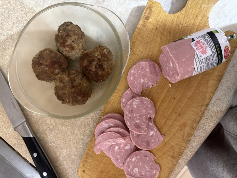 A close-up view displays a food preparation scene in Yambol, Bulgaria. On a light-colored wooden cutting board, several circular slices of a pinkish-purple processed meat sausage are scattered. One end of a partially unwrapped sausage log, bearing a label with Cyrillic text (indicating a Bulgarian product, possibly "ЛеВ" brand), rests on the board. Some sausage slices exhibit irregular contours or partial segments. Adjacent to the cutting board, in the upper right, a clear glass bowl contains four uniformly brown, cooked meatballs. In the upper left background, a knife with a black handle and silver blade, along with a portion of another silver blade, are visible on a textured, light-toned countertop. A person's leg, clad in grey fabric, is partially visible in the lower-left foreground. The arrangement suggests an ongoing process of meal preparation.