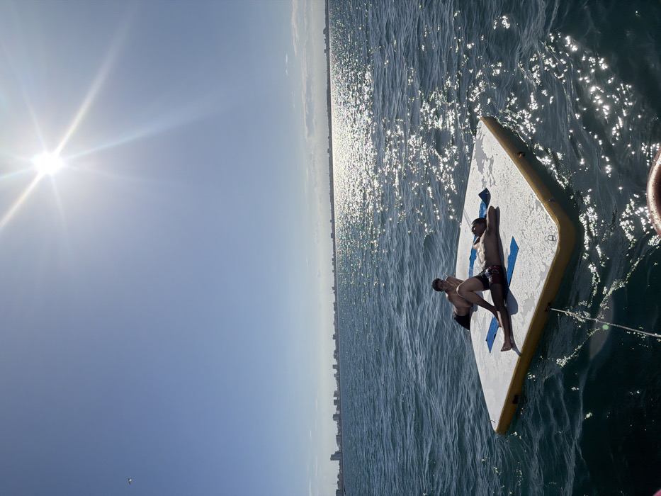 The image depicts an open-water scene under a bright sun and clear blue sky, offshore from Veracruz City, Mexico. Two shirtless males are situated on a rectangular white and yellow inflatable water platform floating on choppy blue-green water. Sun glare creates a bright reflection pattern on the water's surface to the right. In the distant background, a low-rise city skyline is visible along the horizon. One male lies supine on the platform, wearing dark patterned swim shorts. His head rests on a blue towel or mat, and his arms are positioned behind his head. A second male sits upright behind the first, also wearing dark swim shorts, looking towards the viewer with a slight smile. A dark line or rope extends from the front of the inflatable platform, leading out of frame towards the lower right. A small white object, possibly a bird, is visible in the upper left sky.