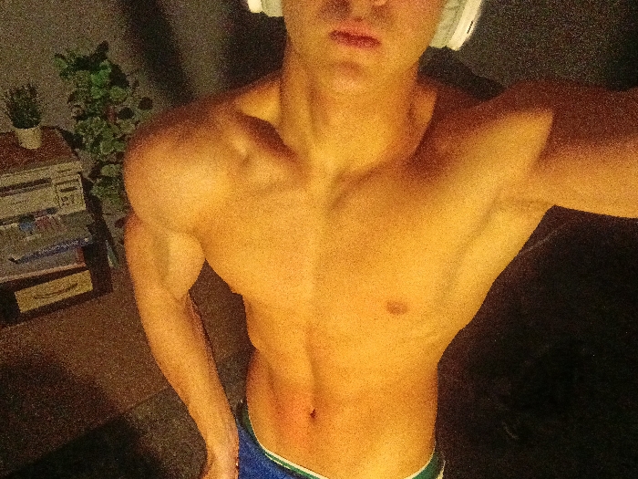 A fair-skinned, muscular person wearing headphones is depicted from the chest up. The person's face is partially visible, showing their mouth. The person is shirtless, with a toned torso, chest, and arms clearly visible. In the background, there is a small potted plant, a shelf with books, and a drawer visible. The lighting is warm, and the image has a slightly grainy texture.