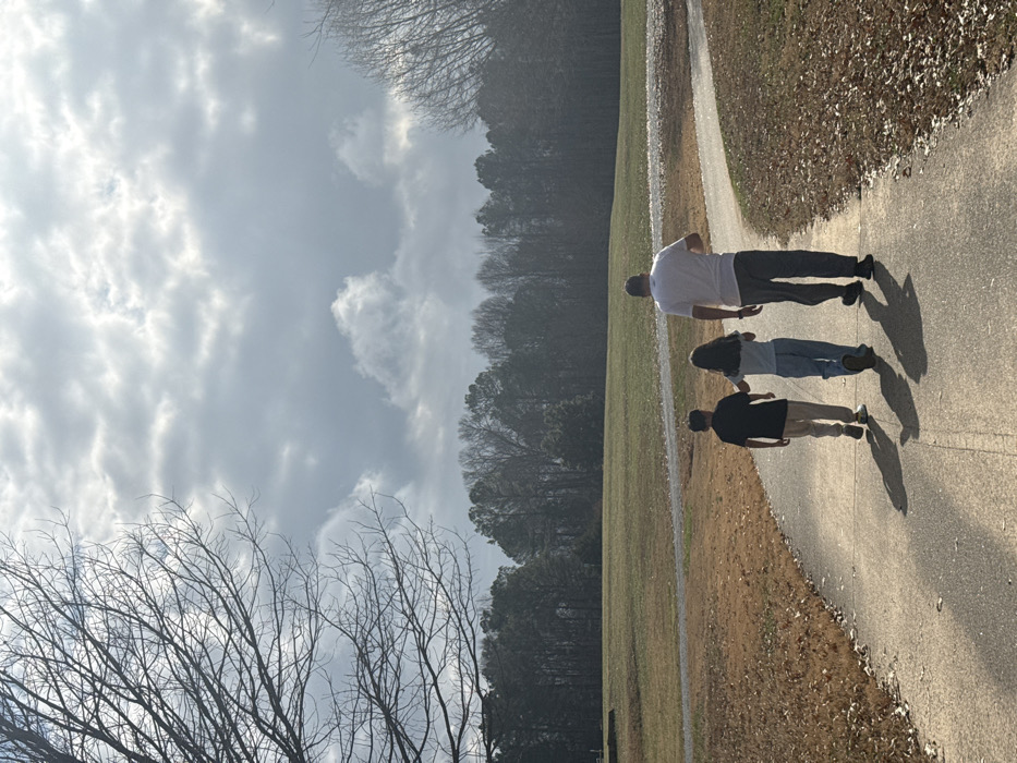 Three individuals are walking on a paved path alongside a grassy area, with trees in the background. The person in front is wearing a white shirt, the middle person is wearing jeans, and the last is wearing a black shirt. Their shadows stretch ahead of them on the path. The sky is filled with clouds.