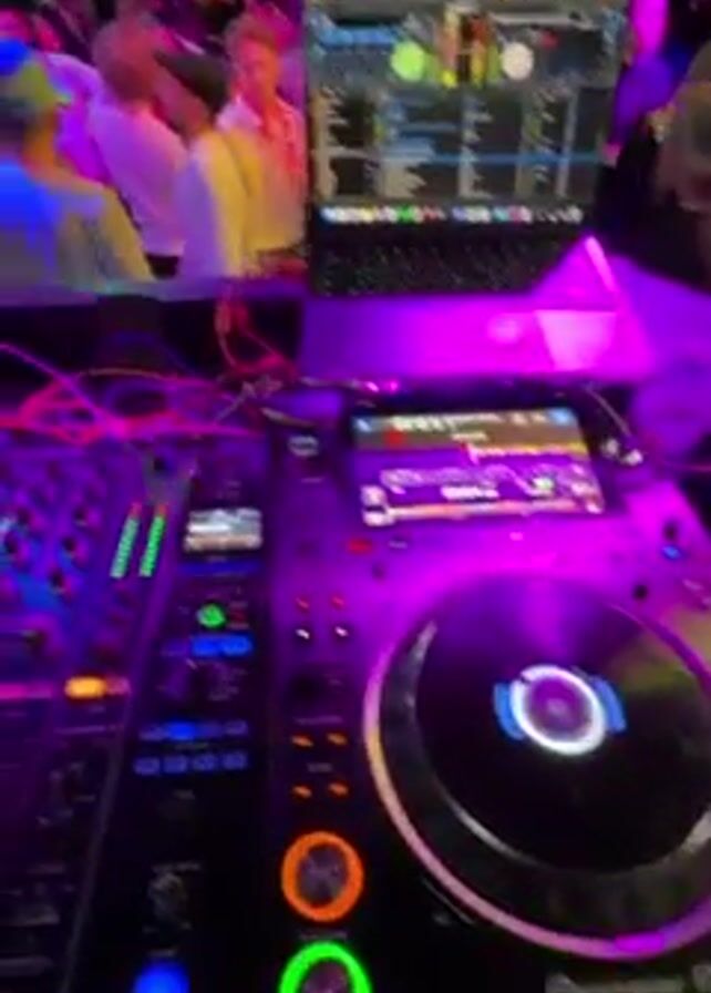 crowded dance floor, viewed from behind a DJ console. The console is a Pioneer DJ system with multiple decks and a mixer, illuminated by bright blue, green, and orange lights. A laptop sits above the console, its screen displaying DJ software. The dance floor is packed with people of various ages, most facing away from the camera, moving to the music. The environment is a club or bar, decorated with multiple disco balls hanging from the ceiling. A large sign with red lettering can be seen in the background. The lighting is predominantly pink and blue, adding to the lively atmosphere.