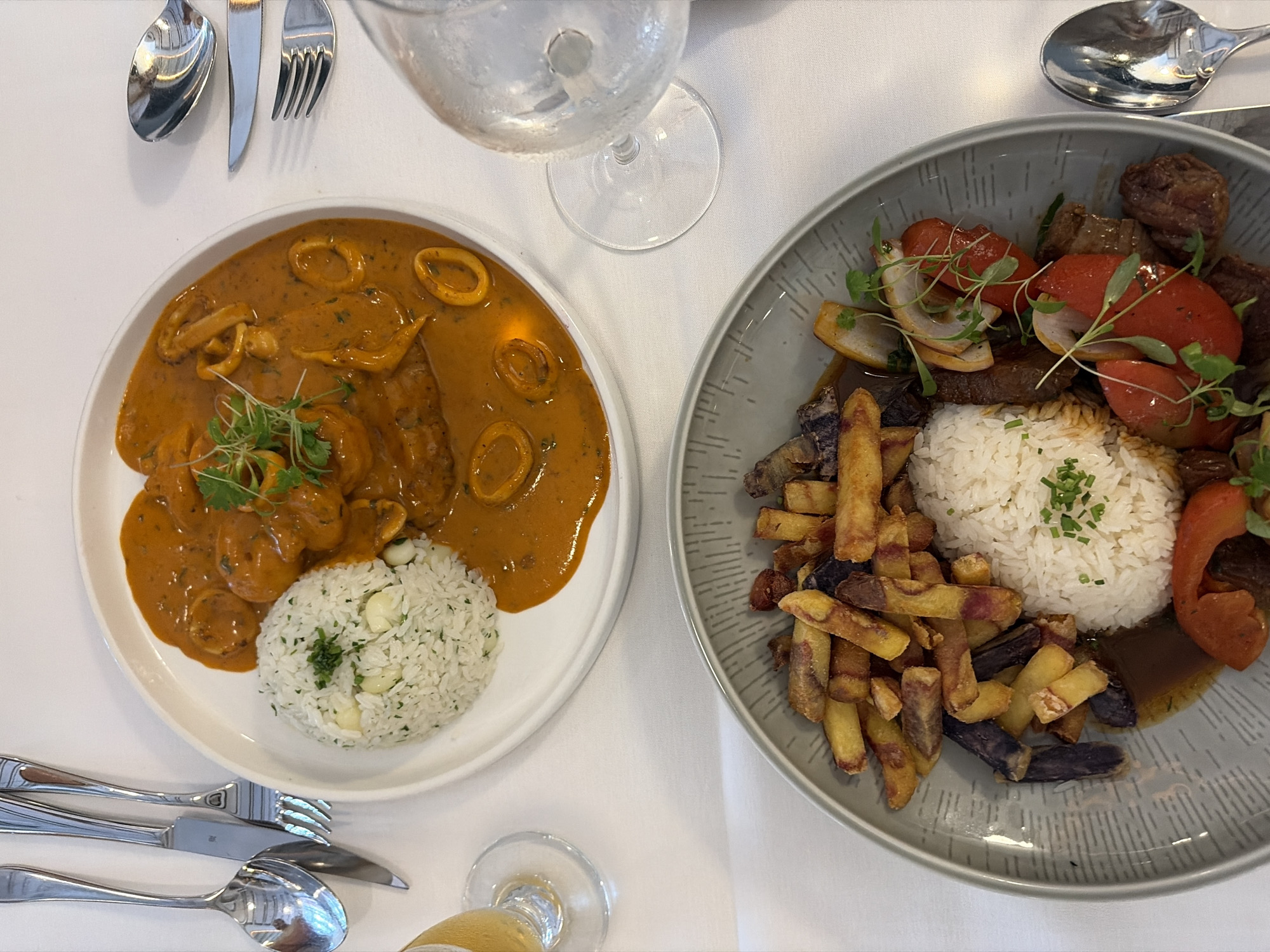 two plates of food on a white tablecloth. A white plate on the left contains seafood in an orange sauce, alongside a mound of white rice with green specks. To the right, a gray plate holds white rice, French fries, meat, tomatoes, and onions. Cutlery (fork, knife, spoon) is present on both sides of the plates, and a glass of water and a glass of beer are also visible. The scene appears to be set in a restaurant in Coral Gables, Florida, United States.
