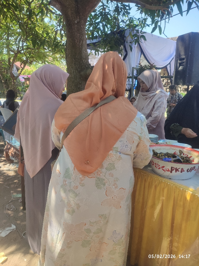 Three women wearing hijabs stand by a table at an outdoor event. The woman closest to the camera wears a floral dress with a light orange hijab and a shoulder bag. Another woman beside her wears a light purple hijab. A third woman with a matching hijab is visible behind them near a wedding tent. A large bowl with food sits on the table in front of the woman in the floral dress. A speaker and other individuals are visible in the background.