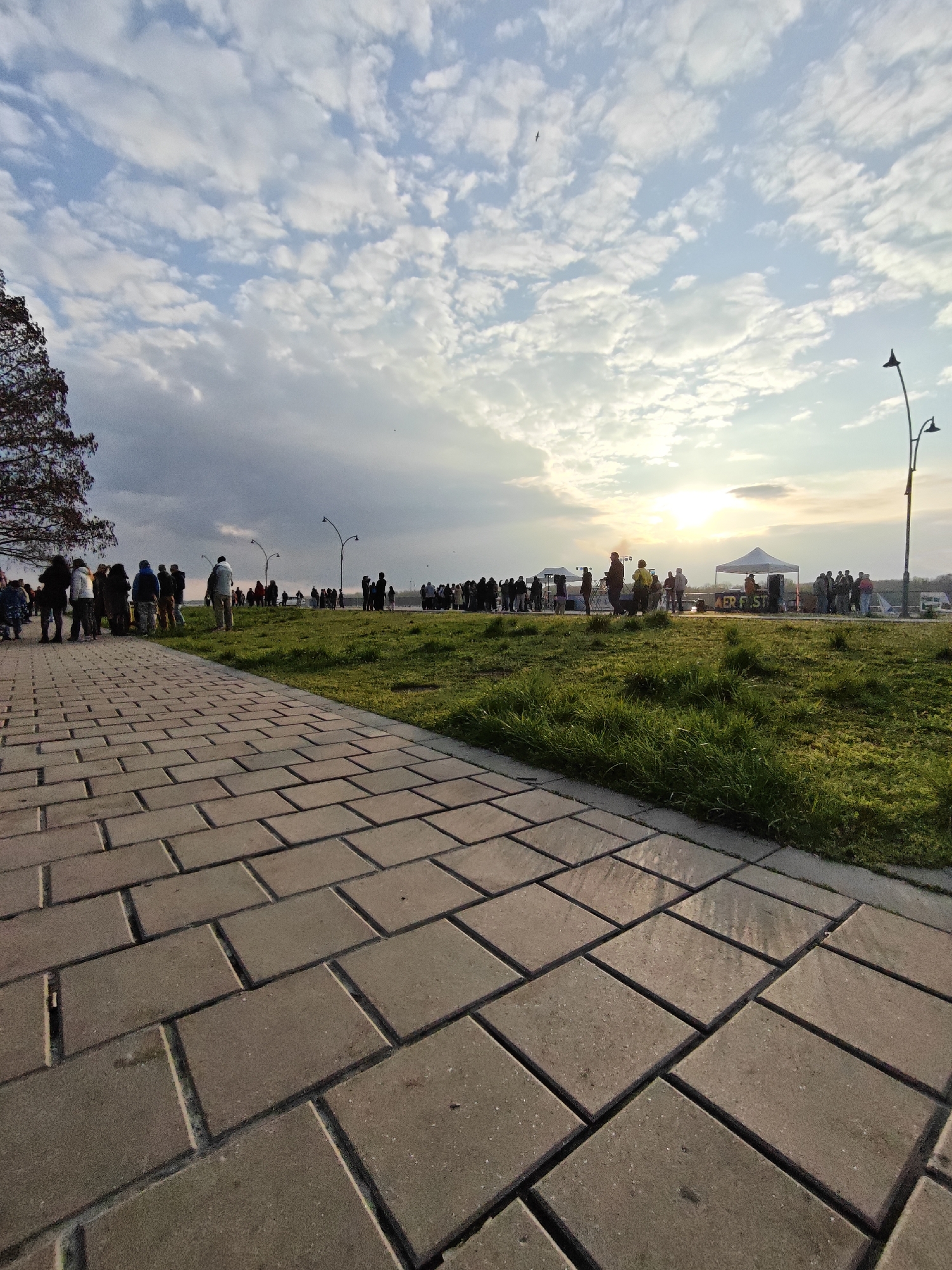 The image depicts a scene on the Danube River embankment in Ruse, Bulgaria, captured at sunset or sunrise. A wide paved walkway, constructed with rectangular paving stones, dominates the foreground and angles toward the background. To the right of the walkway is a grassy area bordering the river. A large group of people, mostly silhouetted against the bright sun, are gathered along the riverbank. Some appear to be standing, while others are possibly near tents or vendor stalls. Light poles line the walkway. The sky is filled with clouds, exhibiting hues of blue, gray, and orange from the sun. A tree is visible on the left side of the frame. A bird can be seen in the sky.