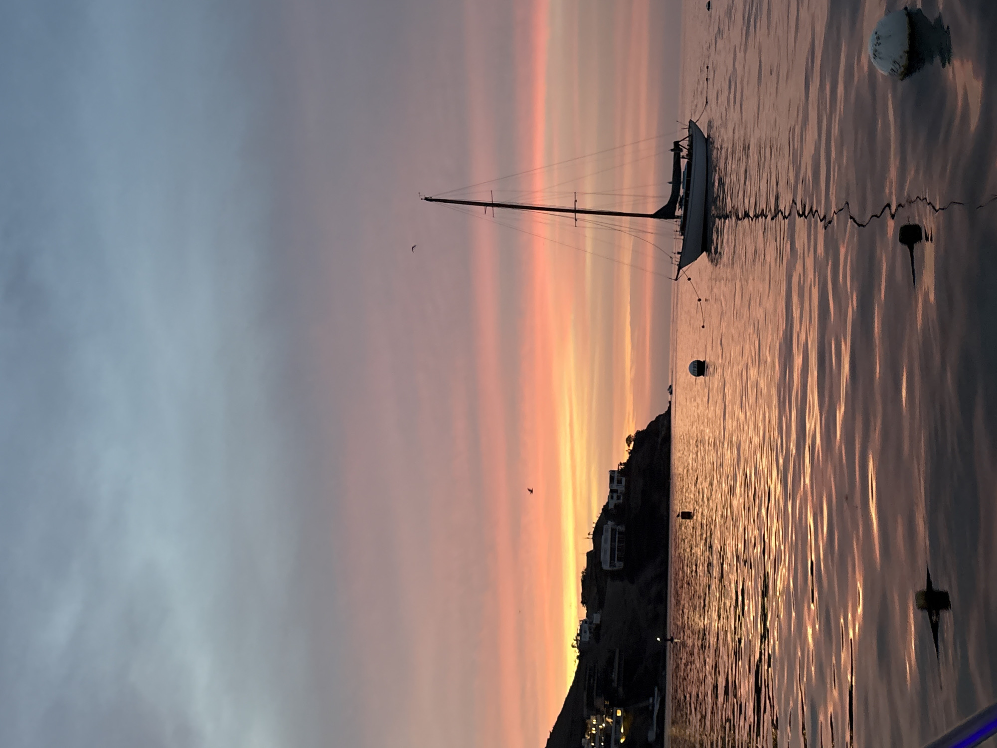 The scene depicts a coastal view at dusk, located in Ancón, Peru. The sky exhibits horizontal stratiform cloud formations with a gradient of colors, transitioning from pale blue-grey at the top to vibrant pinks, oranges, and yellows towards the horizon, indicative of a sunset. The water surface is calm, reflecting the sky's warm hues, creating elongated ripples and reflections. A single-masted sailboat, with its sails furled, is moored in the center-right midground. Its dark silhouette is sharply contrasted against the illuminated sky and water, with a distinct, elongated reflection of its mast and hull visible in the water directly below. Several buoys are visible in the water: one white buoy in the far left midground, one white buoy in the far right foreground, and two smaller, darker buoys between the sailboat and the coastline. To the left, a sloped coastline ascends, featuring multiple residential buildings. These structures, mostly silhouetted, display illuminated windows, suggesting internal lighting. The distant landmass and structures appear dark against the setting sun. Two birds are observed in flight against the colorful sky, one positioned above and to the left of the sailboat's mast, and another smaller bird further to the left.