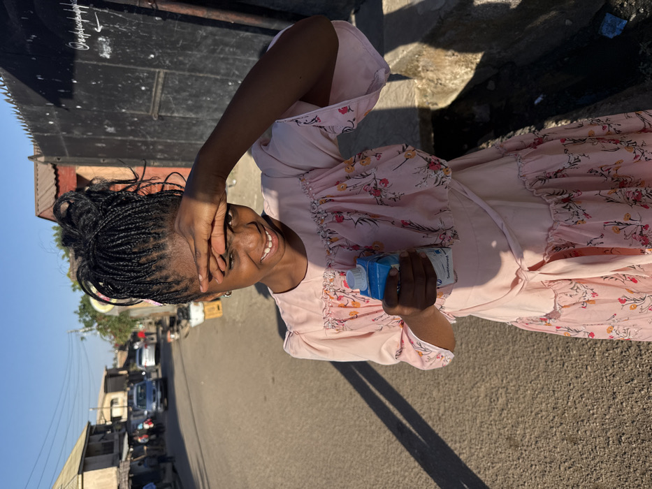 A person with dark skin and braided hair, styled in an updo, stands on a paved street in Jos, Nigeria