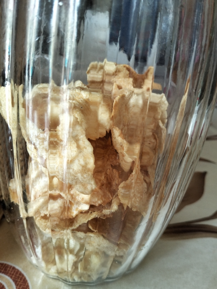 A glass jar filled with waffle cone pieces dominates the frame. The cone shards range from light to dark beige, their textured surfaces distorted by the jar's clear, ribbed glass. Light reflects off the glass, creating bright highlights and obscuring details of the cones within. A tablecloth with a brown pattern is visible beneath the jar.