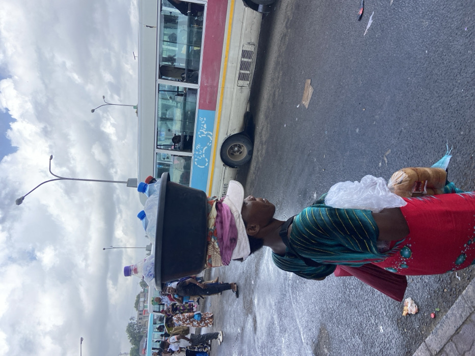 The image depicts a street scene in Dar es-Salaam, Tanzania, under an overcast sky. The ground, including the asphalt road and sidewalk, appears wet, suggesting recent rainfall. In the foreground, a dark-skinned female individual is shown in profile, facing right. She wears a white baseball cap over a patterned cloth or headwrap, a teal and green horizontally striped short-sleeved top, and a red patterned skirt. On her head, she carries a large, black plastic basin filled with clear plastic water bottles, some with blue caps and at least one with a purple cap. In her left hand, held against her side, she carries a transparent plastic bag containing a loaf of bread. A red bag is visible hanging from her left shoulder. In the midground, to the right of the primary subject, a white and red mini-bus (dala-dala) with light blue graphic designs is positioned on the wet road. Passengers are visible through its windows. To the left, further in the background, numerous individuals are standing on the wet pavement, congregating near what appears to be a bus stop or transit point, with another light blue bus partially visible behind them. The background features urban infrastructure, including buildings and multiple streetlights with double-arm fixtures extending over the road. The wet asphalt street shows scattered debris, including cardboard pieces and small plastic items.