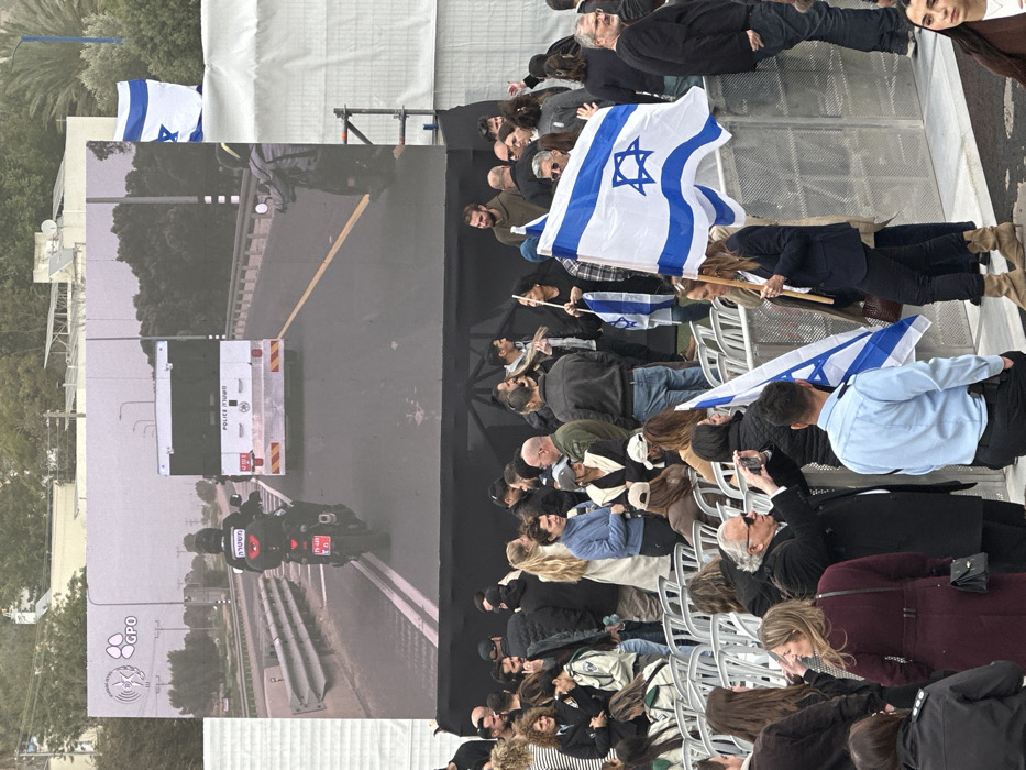 An outdoor public gathering is captured in Meitar, Israel, featuring a large LED screen above a crowd of people