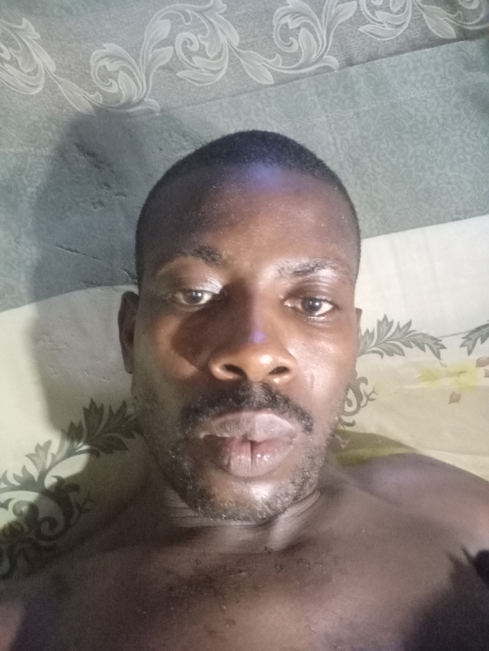 A close-up selfie shows a Black man with a shaved head. He gazes directly at the camera with a neutral expression. His face is somewhat shiny, and a short, dark mustache and beard frame his mouth. The man is shirtless, and his chest is visible. The background consists of a patterned, light-colored pillow or bedding. A light and shadow pattern can be seen on the wall behind the bedding.