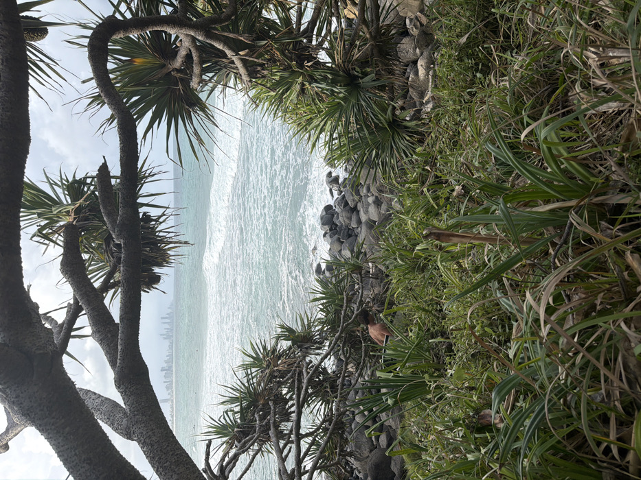 The image captures a coastal view from Burleigh Heads, Queensland, Australia, looking north towards the distant Surfers Paradise skyline. In the immediate foreground, dense green and brownish-green coastal vegetation, including grasses and pandanus plants with their distinctive long, strap-like leaves, occupies the lower half of the frame. Thick, gnarled branches with textured bark, likely from a large pandanus tree, arch across the top and down the left and right sides, framing the central view of the ocean. A shirtless individual, with dark hair and wearing dark shorts, is partially visible in the lower-middle left, positioned within the vegetation near the shoreline. The person is bent forward, appearing to interact with the ground or rocks. Beyond the vegetation, a rocky shoreline is present, composed of numerous grey and dark-grey rounded boulders. The midground features the ocean, displaying light blue-green water with white breaking waves, indicating active surf conditions. Several small, dark figures, consistent with surfers, are discernible in the water to the left of the distant cityscape. On the distant horizon, a prominent skyline of multiple high-rise buildings, characteristic of Surfers Paradise, is clearly visible. The sky above is overcast with light grey clouds.