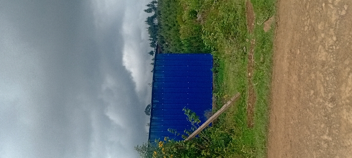 The scene depicts an outdoor environment in Kinale ward, Kenya, under an overcast sky filled with dark grey clouds. In the foreground, a reddish-brown dirt path or road with an uneven, rocky surface extends across the lower portion of the image. The midground features a prominent structure composed of corrugated royal blue metal sheets, appearing as a wall or side of a building, positioned slightly left of center. The metal sheets exhibit vertical ridges and multiple rows of small, white circular fasteners. To the left of this blue structure, dense green foliage, including some plants with yellow blossoms, is visible. A light-colored wooden plank or beam leans diagonally from the lower-left foreground across the green vegetation towards the center. Behind the blue structure and surrounding vegetation, the background reveals a dense stand of coniferous trees, likely a forest or plantation, covering an elevated area. No individuals or active interactions are visible. The overall environment is rural and lush with vegetation, suggesting a natural setting adjacent to a basic dirt thoroughfare.