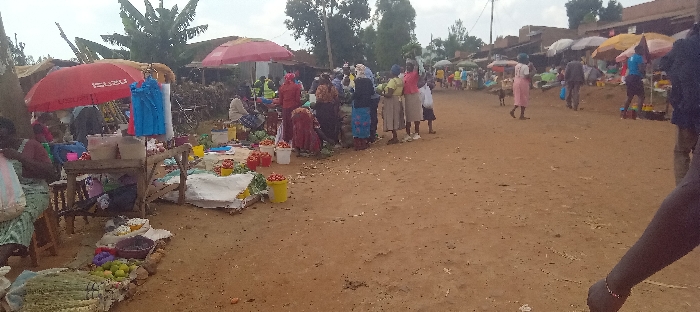 The image depicts an active outdoor market scene on a wide dirt road in Borabu Chitago ward, Kenya