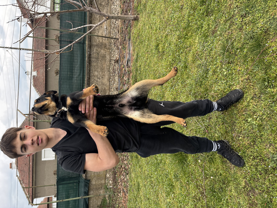 - "A young male stands upright in a grassy outdoor area in Lehchevo, Bulgaria, holding a small black and tan dog vertically with both hands" by FM-TPcbk2, licensed under CC BY 4.0