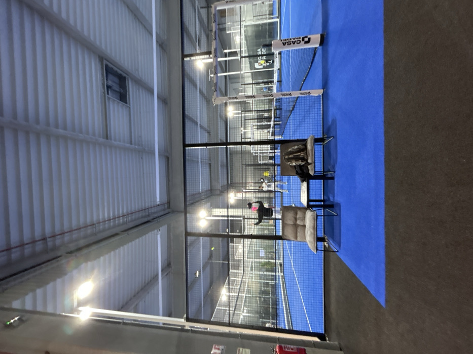 - "An indoor padel court, illuminated by overhead lights, displays blue playing surfaces enclosed by wire mesh walls" by FM-khYMm1, licensed under CC BY 4.0
