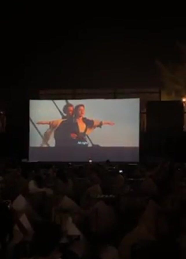 A crowd of people is gathered in an outdoor space at night, watching a large screen displaying a scene from the movie "Titanic