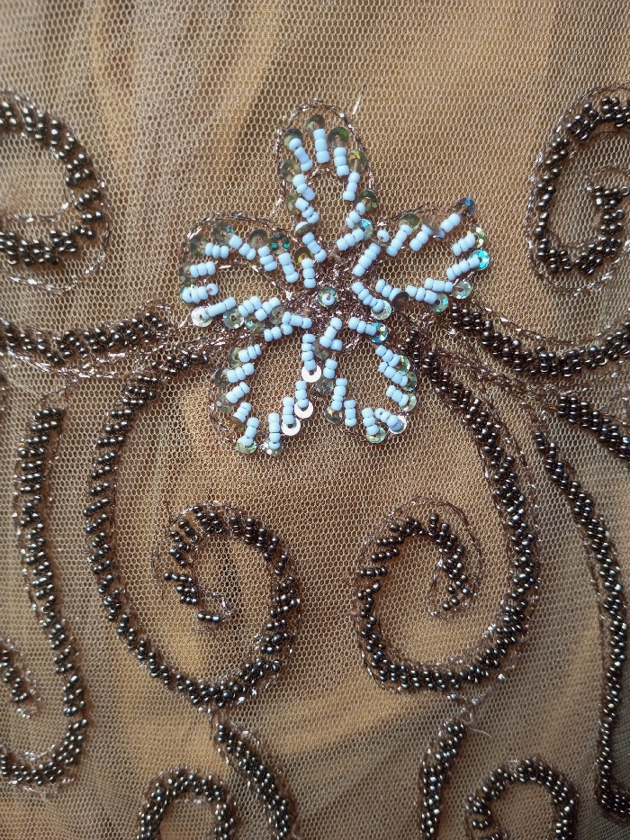 A close-up shot reveals a piece of delicate, sheer fabric adorned with intricate beadwork. A central floral motif is constructed of light blue beads and iridescent sequins. The floral embellishment is surrounded by swirling lines created from tightly packed dark brown beads. The beads are sewn onto the tan netting, creating a detailed, embellished design.