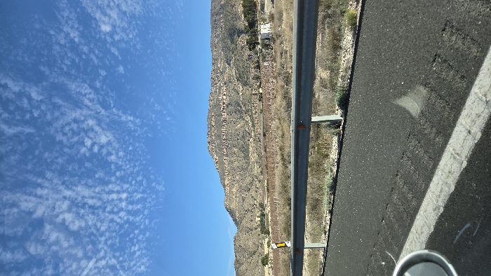The scene depicts an arid, mountainous landscape viewed from a vehicle on a clear day, location Unknown, Unknown. No individuals are present. The upper frame shows a bright blue sky filled with numerous small, scattered white clouds, consistent with cirrocumulus or altocumulus formations, with a faint linear contrail visible in the upper left quadrant. A large, rocky mountain range, characterized by distinct horizontal geological strata and sparse, light-brown vegetation, dominates the background, stretching across the horizon. The midground features a dry, semi-cultivated area containing rows of dormant vines, indicative of a vineyard. Several white-colored buildings and structures, some with red roofs, are scattered among patches of green trees and dry brush on the right side of this terrain. A dark, horizontal barrier or fence runs across the midground, partially obscuring the vineyard. A yellow and black reflective road marker is attached to a post behind a grey metal guardrail in the left midground. The immediate foreground consists of a paved asphalt road surface exhibiting cracks and wear. A solid white line defines the left edge of the visible road. A grey metal guardrail, comprising two horizontal rails supported by vertical posts, runs horizontally across the lower portion of the frame, separating the road from the midground. A partial reflection of a vehicle's side mirror is discernible in the bottom left corner, indicating the point of view from inside a vehicle. Dry vegetation and light-colored gravel are present between the road and the guardrail.