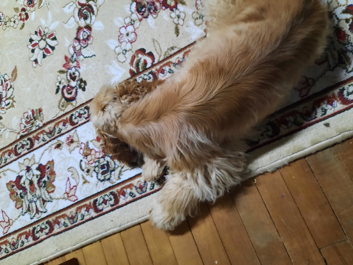 An indoor scene features a light brown, long-haired dog, consistent with a Cocker Spaniel breed, lying on its left side. The dog occupies the central and lower-left portions of the frame, with its head oriented towards the top-left and its body extending towards the bottom-right. Its fur is wavy and appears well-maintained. The dog rests partially on a beige rectangular rug, which features a repeating floral pattern in shades of red, brown, and green, and partially on a light brown wooden plank floor. The rug exhibits a patterned border with geometric motifs. The wooden floor, visible on the left side, consists of parallel planks. The edges of the rug show minor wear. No people are visible. The specific location within Arkhangelskoye, Russia, cannot be determined from the visual information presented.