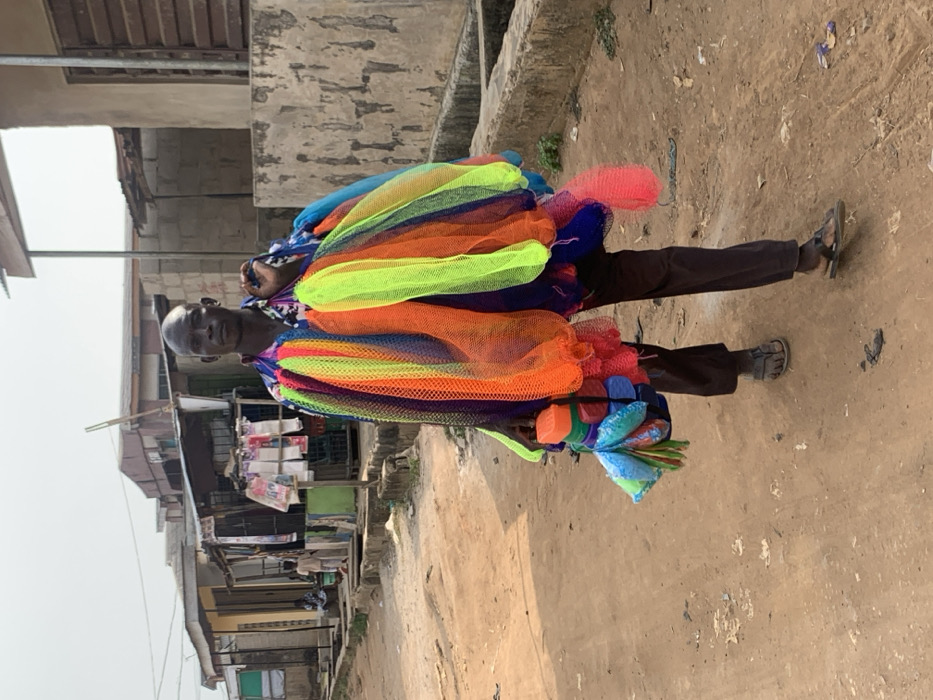 An individual, presumably a vendor, is carrying a large assortment of colorful mesh-like products. The items are stacked high on their person, predominantly in shades of orange, blue, green, and pink. The person is wearing brown pants and sandals, standing on a dirt-covered street. Buildings, including some with corrugated metal roofing, line the background, suggesting a developing or impoverished area.