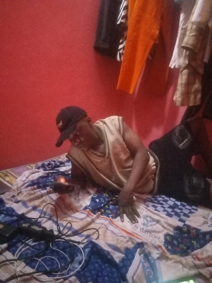 A man lies on a bed covered with a patterned Louis Vuitton blanket. He wears a sleeveless shirt and a baseball cap, looking down at a small, glowing object in his hand, possibly a lighter or a lit cigarette. His dark trousers blend into the background. Behind him, a red wall and a crowded clothes rack display various garments. Wires and electronic devices clutter the bed near his hand.