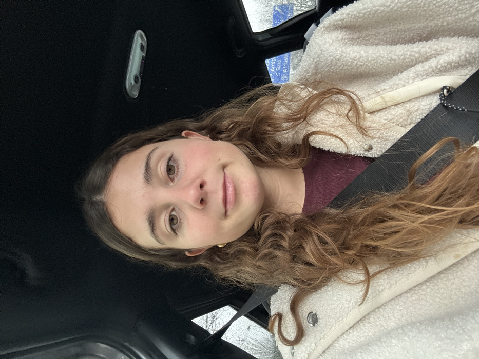 A young female is depicted from the chest up, positioned in the front seat of a vehicle, taking a selfie