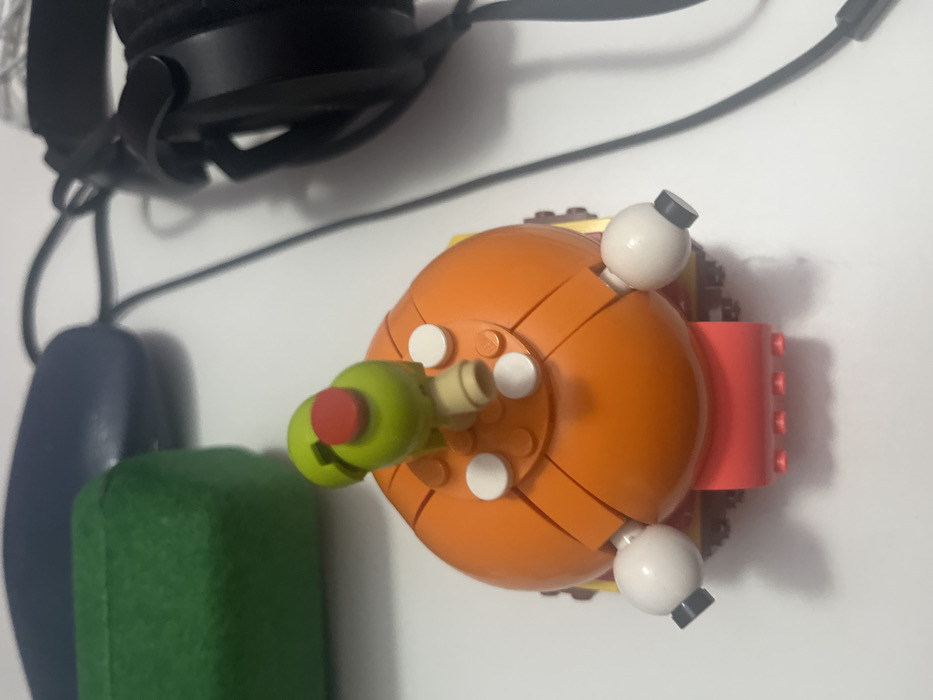 A static, slightly overhead forensic photograph captures a desktop scene in Gosnells, Australia. The central object is a multi-colored LEGO model, approximately 10-12 cm in diameter, resembling a stylized hamburger or character. Its dominant feature is a spherical orange structure, accented with four white round 1x1 tiles on its upper surface. A tan stem protrudes vertically from the top, capped by two light green 1x1 round bricks and a red 1x1 round plate, collectively suggesting an olive with a pimiento. Two white spherical LEGO elements, each terminating in a black cylindrical tip, extend laterally from the mid-section of the orange structure. A red rectangular base, constructed from LEGO bricks, is visible beneath the main orange body. The model rests on a clean, white, flat surface. The background is out of focus, revealing a dark green rectangular object (possibly a glasses case) on the far left, a dark blue computer mouse positioned behind it, and a pair of black over-ear headphones with a connected black cable positioned on the right side of the frame. No individuals are present.