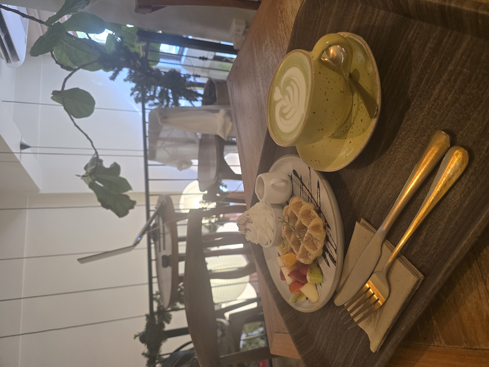 A café interior in Suthep, Thailand, displays a light meal arrangement on a dark wooden tray positioned on a lighter wooden table. The tray holds a round white plate featuring a single waffle dusted with powdered sugar and drizzled with chocolate sauce, accompanied by a small white bowl of whipped cream, a small white creamer pitcher, and a selection of cut fruits including kiwi, strawberries, and light-colored melon pieces. Adjacent to the plate, a speckled yellow ceramic cup contains a green beverage with intricate latte art (a heart/rosetta pattern), resting on a matching saucer with a silver spoon. A set of gold-colored fork and knife rests on a beige napkin to the left. In the background, a wooden chair is partially visible, followed by an open, minimalist interior with white walls or blinds. A black metal railing separates the immediate area from a further section where a round wooden table holds an open silver laptop. Green foliage from various potted plants, including a large-leafed plant and a smaller conifer-like shrub, are visible, along with an overhead air conditioning unit. No individuals are present in the frame, and no specific actions or interactions are depicted.