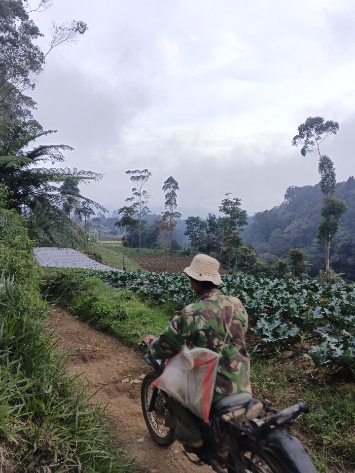 An individual is depicted from the rear, operating a motorcycle on a dirt path in a rural, hilly agricultural area within Pinnwe, Myanmar (Burma). The person wears a camouflage long-sleeved shirt and a light-colored bucket hat. A white plastic bag with red markings is suspended from the motorcycle's front. To the immediate left of the path, a steep bank is covered in dense green grass and large fern-like plants, transitioning into terraced agricultural fields, some utilizing white plastic sheeting over young crops. To the immediate right of the path, a cultivated field contains rows of mature green leafy plants, consistent with a brassica crop. The background reveals a landscape of rolling hills and mountains densely covered with various trees, including several tall, slender specimens with sparse foliage. The sky is uniformly overcast with light gray clouds, indicating a non-sunny condition, possibly misty or hazy in the distance. The overall scene suggests farming activity in a mountainous region.