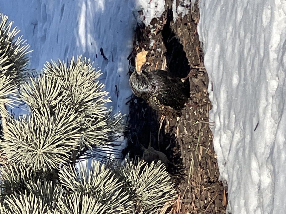 A European starling is nestled in a tree cavity. The bird's dark, speckled plumage contrasts with the surrounding snow and weathered bark. To the left, a branch of pine needles adds a touch of greenery. Snow is visible on the side of the tree as well as in the background to the left. The bird seems to be seeking shelter from the cold, harsh conditions of the winter landscape.