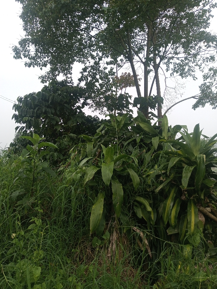 The scene is located in Irupalai, Sri Lanka, depicting a dense, overgrown natural area under an overcast sky. The foreground is characterized by tall green grasses and various weeds. The midground contains a prominent cluster of broad-leafed plants, some exhibiting yellow variegation, positioned adjacent to darker green shrubbery with ovate leaves. In the background, the multiple trunks and leafy canopy of a large tree are visible, extending towards the upper frame. Faint utility lines are present in the upper left quadrant against the light grey sky. No human figures, animals, or explicit actions are observed within the frame.