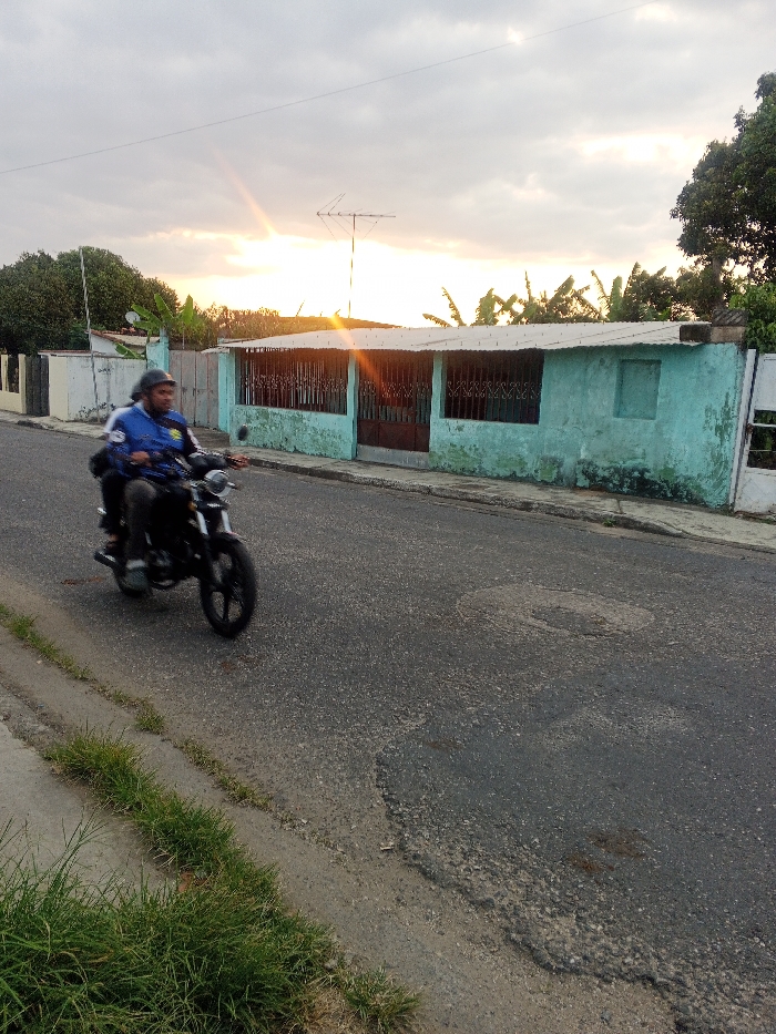 The image captures a street scene in Tinaquillo, Venezuela, under natural light from a low sun, suggesting either sunrise or sunset, with a visible solar flare