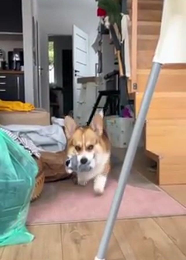 A corgi dog is inside a house, carrying a gray-and-white toy in its mouth. The dog is walking towards the camera, which is positioned low to the ground. The dog has a brown-and-white coat with black markings. It is wagging its tail. The house has wooden floors and a staircase in the background. There are also some boxes and bags on the floor, and a green trash bag is visible. The lighting is bright and the scene appears to be in a living or dining area of the house.
