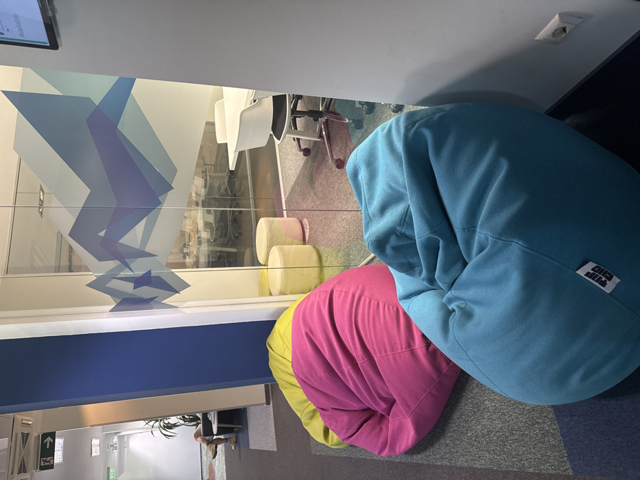 The image displays a modern office interior within the Tipi Cliq premises in Sofia, Bulgaria. In the foreground, three large, cushioned bean bag chairs are positioned on a carpeted floor: one teal with a "Tipi Cliq" brand label, one vibrant pink, and one lime green. A floor-to-ceiling glass partition, featuring a horizontal band of frosted blue and purple abstract geometric patterns, separates the foreground space from an interior room. Through the glass partition, two yellow cylindrical poufs are visible on a carpeted area. Beyond these, a meeting or office room is visible, furnished with a white rectangular table and several white rolling office chairs. Reflections of additional office furniture and light sources are present on the glass. To the left of the glass partition, a hallway or open-plan office area extends into the background. Here, the lower legs of an individual, dressed in shorts and light-colored shoes, are visible, indicating they are seated on a piece of furniture out of frame. An illuminated green "Exit" sign with a right-pointing arrow is mounted on the wall in this hallway. Overhead fluorescent lighting fixtures are integrated into the ceiling throughout the visible areas. A digital display screen mounted on a wall inside the glass-enclosed room shows the word "Available." The flooring is primarily carpeted, featuring various shades of grey, blue, and subtle colorful patterns.