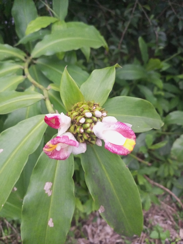 A vibrant tropical plant features elongated, lance-shaped leaves, displaying a lush green color. At the center of the plant, a dense cluster of buds transitions into unique flowers with white petals edged in bright pink and accented with yellow. These flowers are arranged around a globular head of unopened buds, exhibiting a mix of green and white hues. The background suggests a natural, possibly wooded, environment.
