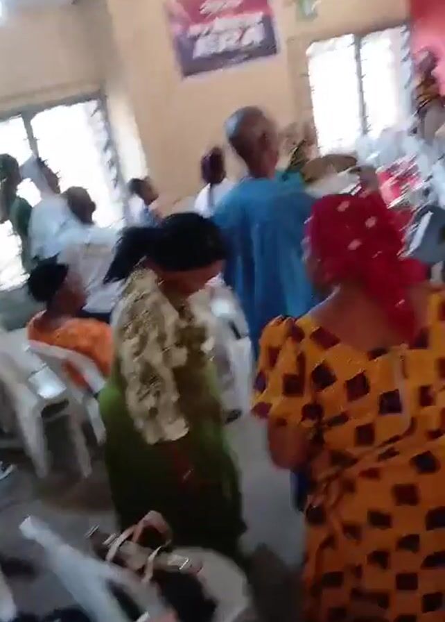 n indoor event, possibly a church service, with a band performing on a small stage. A man in a light blue suit is singing and gesturing, while other band members play instruments, including drums and a guitar. Several people are standing and facing the stage, some of them clapping or dancing to the music. The room is brightly lit and has white folding chairs scattered around. There is a poster on the wall with the words "2023 Victory Era." Some attendees are wearing colorful traditional attire.