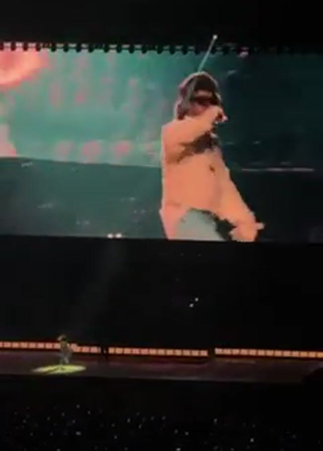 concert setting with a performer on stage. A large screen behind the stage displays a close-up of the performer, who is wearing a white jacket and sunglasses. The performer is dancing and gesturing with their arms while singing. A spotlight shines on the stage, illuminating the performer. The audience, visible as a sea of dark figures, is cheering. The stage is decorated with red lights.
