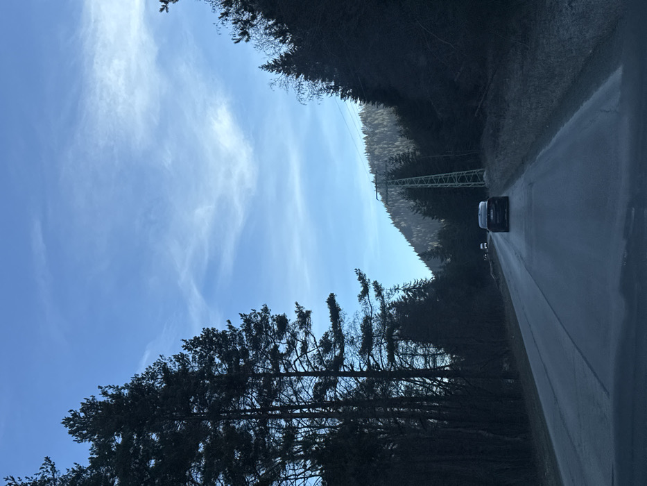 The image depicts a two-lane asphalt road traversing a mountainous, heavily forested area near Beli Iskar, Bulgaria, under a clear blue sky with sparse, wispy white clouds. The perspective is from inside a moving vehicle, looking forward. A dark-colored sedan is positioned centrally on the road approximately 50-70 meters ahead. Further down the road, two lighter-colored vehicles are visible in the distance. Dense coniferous forests line both sides of the road, extending up the inclining hillsides. On the right side of the road, a tall, green metal lattice-work pylon, supporting overhead cables, stands within the forest. The road surface appears damp or reflective, possibly from moisture or frost. No individuals are explicitly visible.