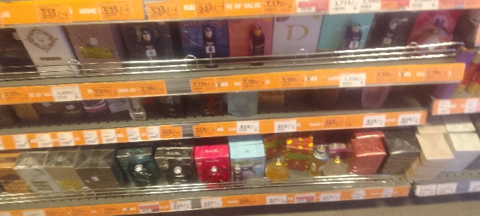 This image depicts a retail display of multiple shelves stocked with perfumes and fragrances, located in Viwandani ward, Kenya