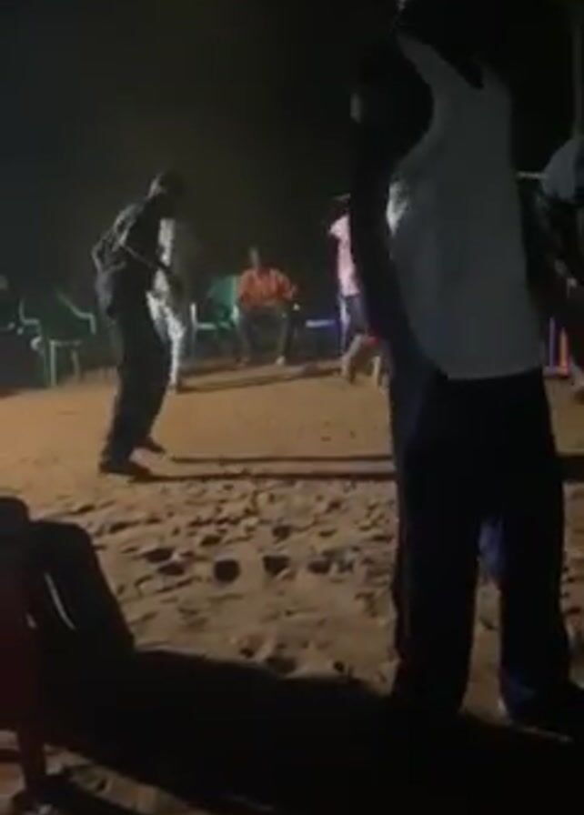 The video captures a night scene outdoors, where a group of people has gathered on what appears to be sandy ground. Several individuals are visible, with some seated in chairs around the periphery. In the center of the frame, two people are engaged in dancing or some form of physical activity under dim lighting. One person, seen closer to the camera, is wearing a white tank top and dark trousers, while another person is in darker clothing, making it difficult to discern specific details. There are some green and other colored chairs around the ground where they are gathering. Overall, the scene conveys a sense of a casual outdoor event or gathering in a low-lit environment.