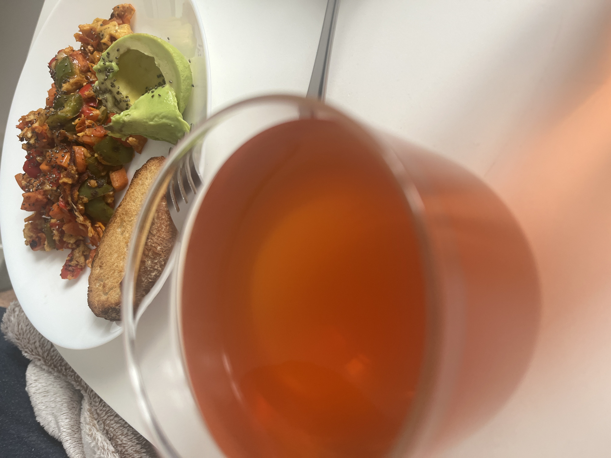 plate of food and a glass of orange liquid. The food consists of what appears to be scrambled eggs with vegetables (possibly peppers and carrots) and chia seeds, along with a slice of avocado and a piece of toast. A fork is also visible on the plate. The orange liquid is in a clear glass. The setting appears to be indoors on a white surface. There is no indication of the location being in Mogán, Spain, nor any other identifying information about a specific city or people.