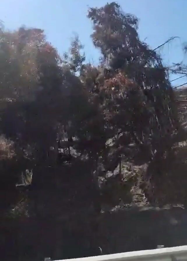 landscape devastated by fire. The camera moves, capturing charred trees and scorched ground along a hillside. A guardrail is visible in the foreground, suggesting the view is from a road. There are also remnants of structures atop the hill, seemingly damaged or destroyed by the fire. The sky is clear and blue, contrasting starkly with the blackened scenery.