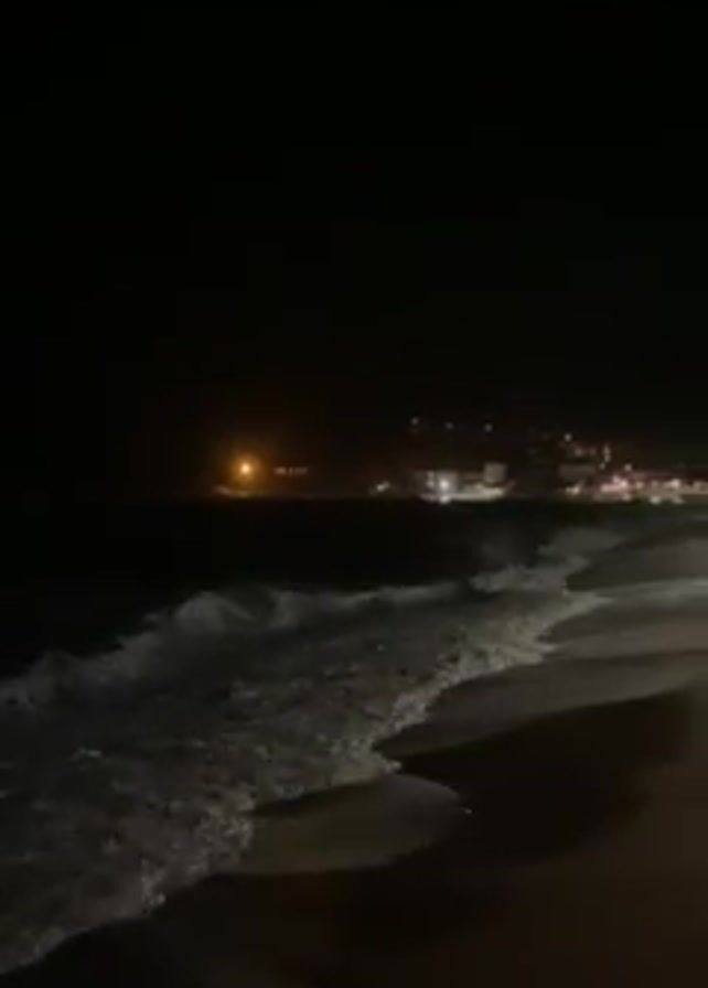 - ". The video shows a beach at night. Waves are crashing on the shore, and there are lights visible in the distance, suggesting a town or city. A wet promenade runs along the beach, illuminated by streetlights. The scene is dark and appears to be after a rainstorm, with reflective surfaces indicating moisture." by FM-1ntxd2, licensed under CC BY 4.0