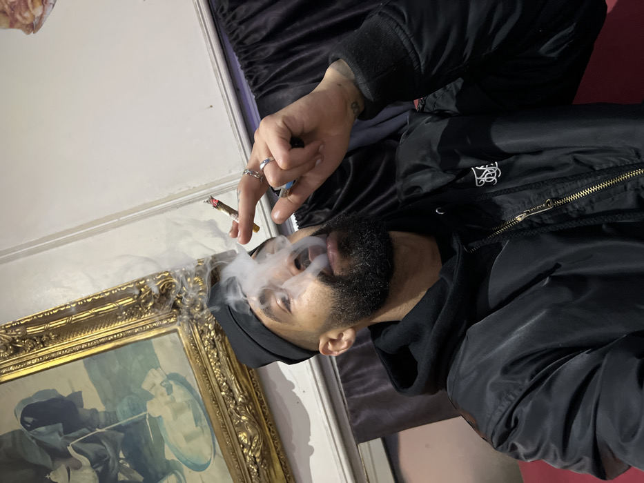 A man with a beard and black beanie holds a lit cigarette, exhaling smoke. He wears a black jacket over a hoodie. Rings adorn his fingers. An ornate gold-framed painting is visible on the wall to his left. The background includes a dark-colored velvet surface. The image is rotated counter-clockwise.