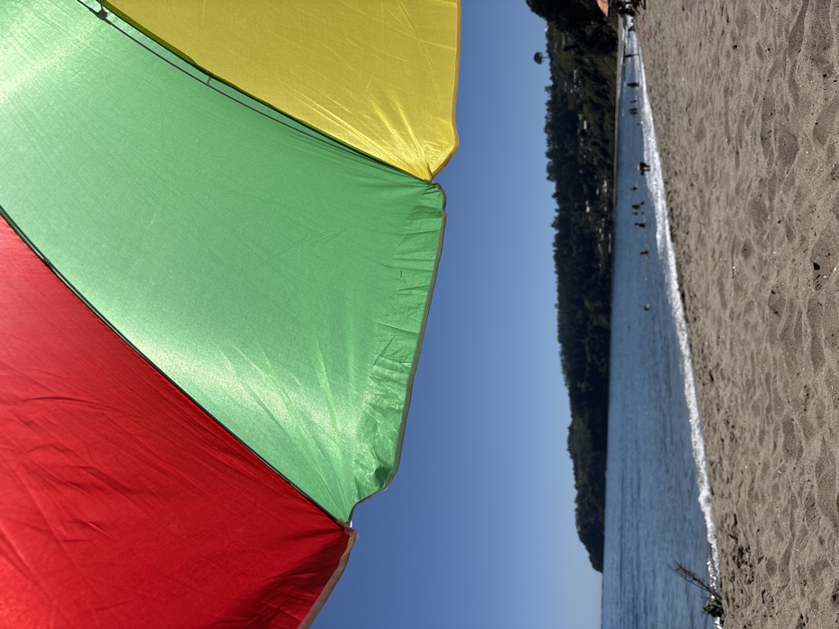- "The scene depicts a beach in Tomé, Chile, viewed from beneath a multi-colored beach umbrella" by FM-CB7hJ2, licensed under CC BY 4.0