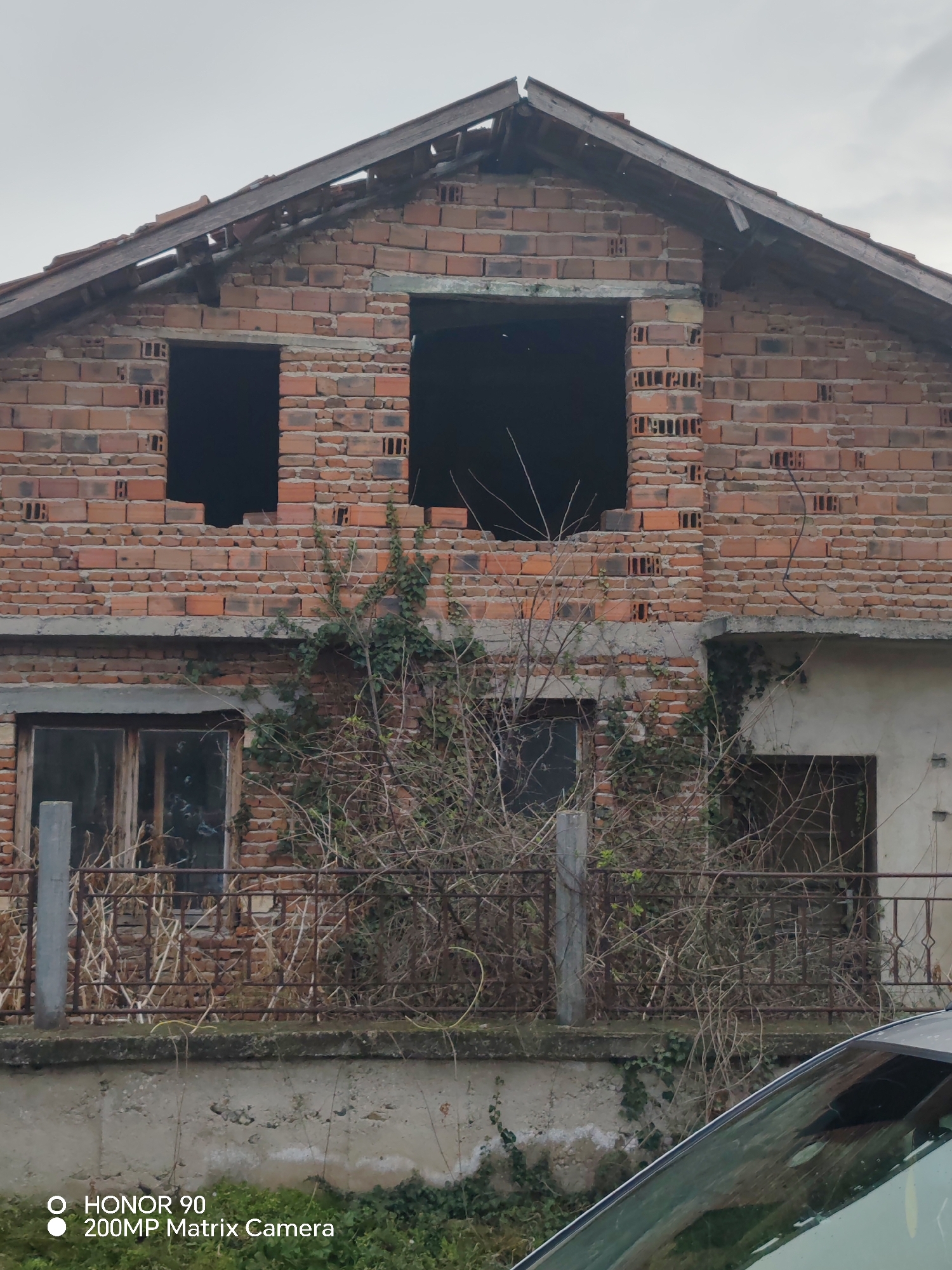 An exterior, eye-level view captures a derelict two-story brick building in Rosen, Bulgaria, under a uniformly overcast, light grey sky. The building, constructed predominantly from exposed reddish-orange hollow bricks, features a damaged pitched roof with missing tiles and visible wooden rafters. The upper story contains two large, dark, empty rectangular openings for windows or doors. A concrete lintel separates the upper and lower floors. The lower story on the left presents a multi-paned wooden-framed window. To the right, another dark, empty rectangular opening is present. The lower facade is heavily overgrown with dense, bare, tangled woody vines and scattered green ivy. A dark, ornate metal railing, supported by a grey vertical post on the left, runs along the front of the lower story, atop a concrete ledge. Below the ledge, a concrete foundation or retaining wall shows signs of wear. The hood and windshield of a dark-colored vehicle are partially visible in the lower right foreground, angled towards the left. No individuals are present in the scene.