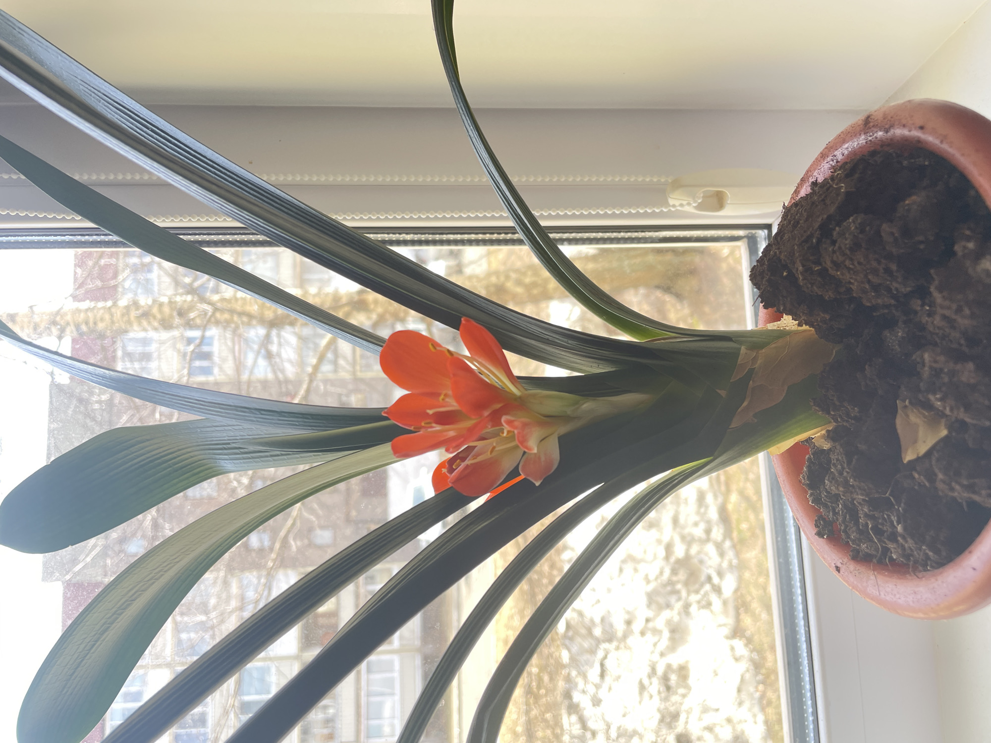 A potted Clivia plant sits on a windowsill