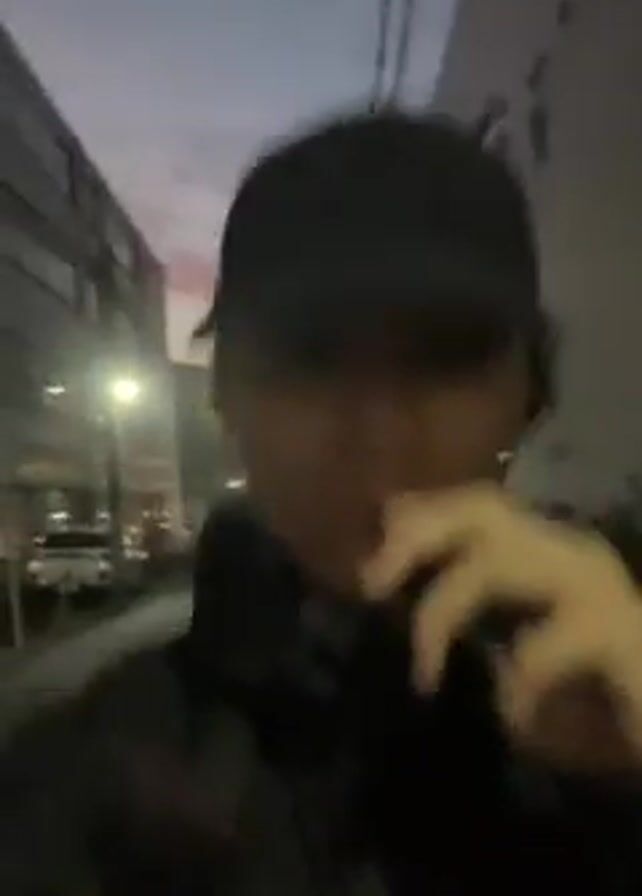 A person wearing a black baseball cap, a black jacket, and black gloves walks down an empty street bordered by buildings. The sky is a mix of grey and orange. The person appears to be vaping.