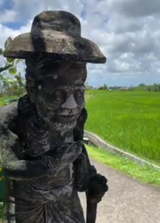 stone statue of an elderly man wearing a hat, holding a staff, standing beside a narrow paved path. Behind the statue is a lush green rice field under a partly cloudy sky. The statue is weathered and covered in moss. The path leads through the rice field. There is wind blowing through the scene. A vehicle is heard in the background.